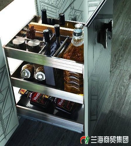 調味拉籃常常被做成抽屜式或縫隙式。縫隙式的拉籃可以說是把櫥柜的空間利用率提到最高。如果是抽屜式的隔斷,一般采用的是類似塑料的材質或不銹鋼,不過塑料是不同于一般塑料,環保級別能達到食品級的。